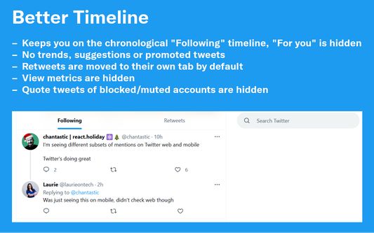 • Defaults to the "Following" (chronological) timeline, automatically switching you back if Twitter tries to move you to the "For you" (algorithmic) timeline