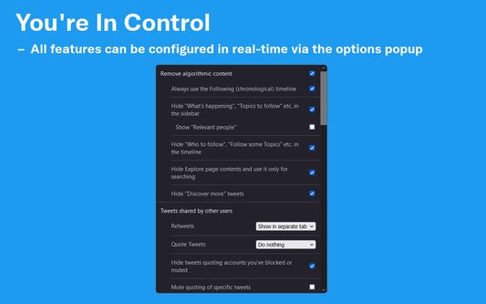 By default, your Home timeline will be the reverse-chronological "Following" timeline, which will only contain tweets and quote tweets from the people you follow. The algorithmic "For you" timeline will be hidden, and Control Panel for Twitter will keep you on "Following" if Twitter tries to automatically take you off it. Everything is configurable, so start by opening the options popup and customizing to your liking. Changes you make in the options will be applied immediately.