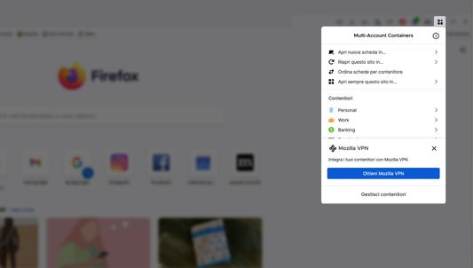 - Protect your browsing activity in individual Containers using Mozilla VPN, so you can shop while travelling abroad but check your bank account from a server in your home country.