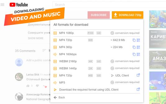 UDL Helper is a powerful downloader for YouTube. In most cases, you can download MP3 or MP4 file with one click, otherwise, please, follow the link to uniLoader website and use UDL Client software (Windows only). In addition to regular videos, you can download Shorts with no extra tools. The extension also supports downloading videos from other social media services: Instagram and Odnoklassniki.