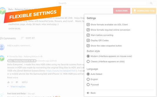 Most extension features are universal for any video service, but some features are service-specific. See details on UDL Helper’s page. Extension features for YouTube are listed below.