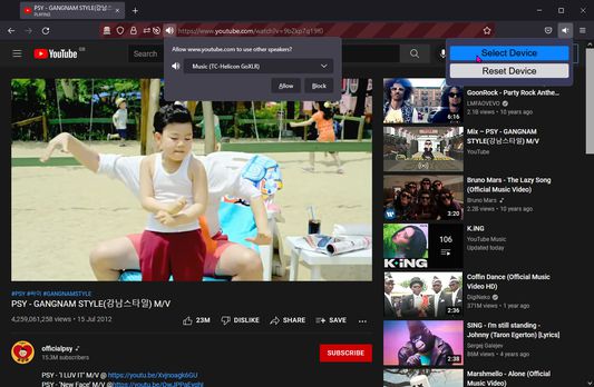 NOTE: Currently the extension only updates elements on the page when it is run. This means new elements will not use the selected audio device without rerunning the script. This is a problem for social media sites, such as Twitter and Reddit. I'll look into supporting this behaviour in future.