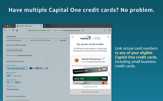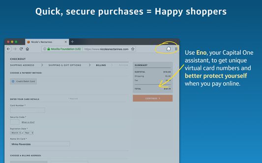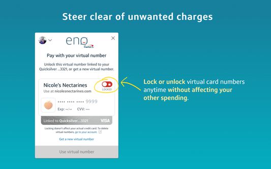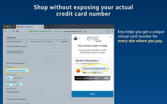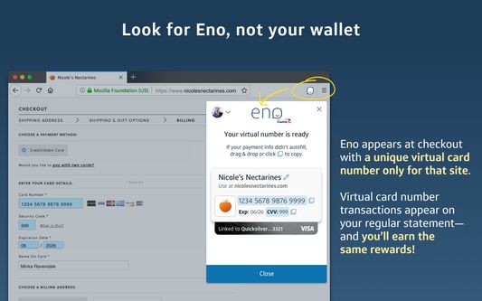Eno appears at checkout and provides a unique virtual card number only for that site, allowing you to shop online without exposing your actual credit card number.