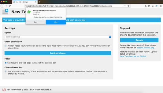 New Tab Override requires additional permissions, but Firefox does not prompt requests for the following: