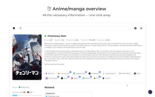 This extension syncs with your favorite anime databases: MyAnimeList, AniList, Kitsu, Simkl — and integrates them into your favorite streaming sites with auto episode tracking.
