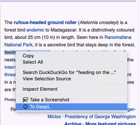 Right-click on a section of text and click on "To DeepL" to translate it to your language. Default language is selected in extension preferences.