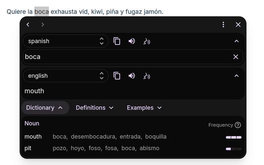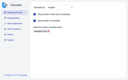 - Select-and-translate: highlight text and click the button to get a translation