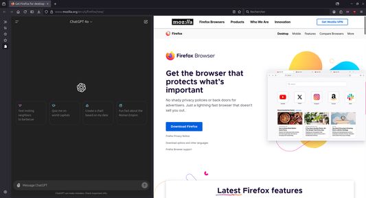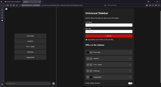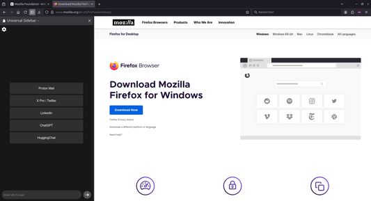Ouvrez des sites web dans une barre latérale pour un accès rapide et facile. Ajoutez des outils d'IA et des réseaux sociaux comme ChatGPT, Perplexity AI, HuggingChat, Claude AI, X (Twitter), Whatsapp, Telegram, etc.