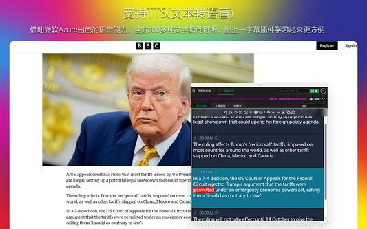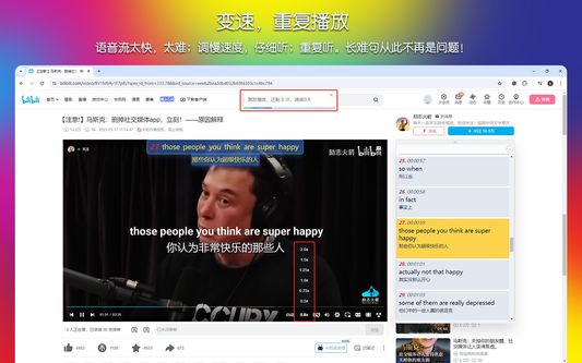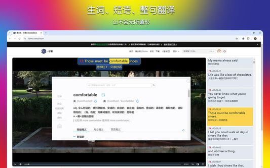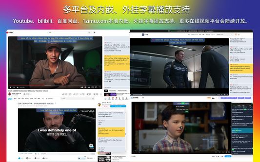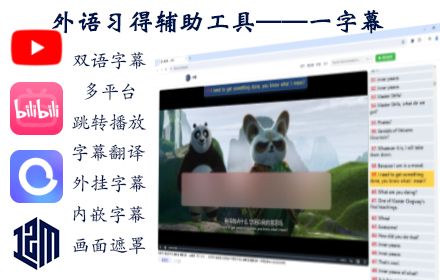 一款免费的支持双语的音频、视频字幕的辅助插件。可按单词,短语,整句翻译;支持(YouTube,Bilibili ,百度网盘等平台);亦可支持本地外挂字幕和内嵌字幕。可变速、重复播放、跟读、画面遮挡。