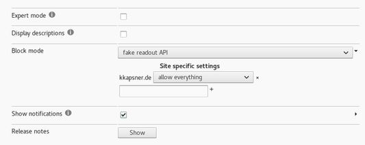 This add-on allows users to prevent websites from using some Javascript APIs to fingerprint them. Users can choose to block the APIs entirely on some or all websites (which may break some websites) or fake its fingerprinting-friendly readout API.