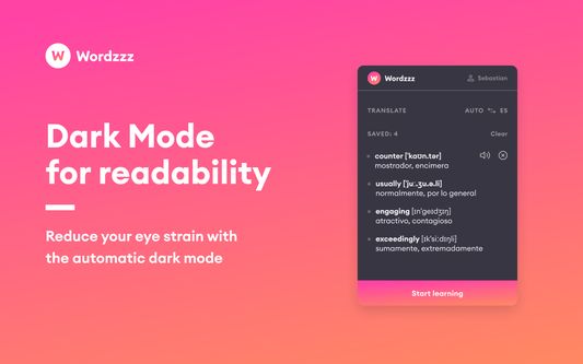 Boost your language learning with Wordzzz ★ TRANSLATE TEXT WHILE BROWSING ★ SAVE NEW WORDS ★ PRACTICE YOUR VOCABULARY ★ EASILY SWITCH LANGUAGES ★ DARK MODE FOR READABILITY