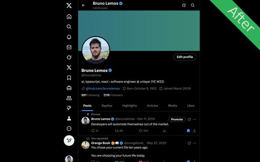 Improve the Twitter/X experience by making the layout minimal: No trends column, no giant menu, no distracting elements. Focus on what matters: the content.