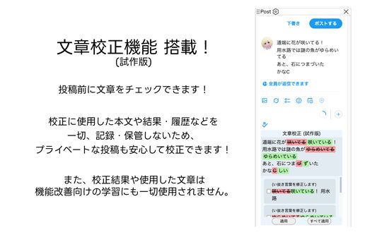 ※2 文章校正機能で使用した文章や校正結果・履歴などは一切記録・保管しません。