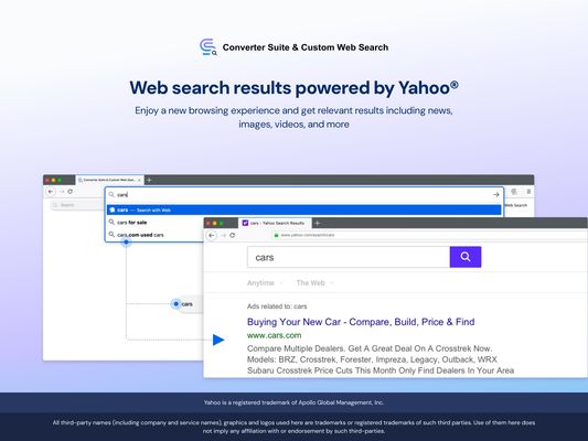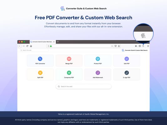 Add the Converter Suite & Custom Web Search extension to convert files by clicking the favicon on the toolbar & to access Yahoo!® search from your browser.