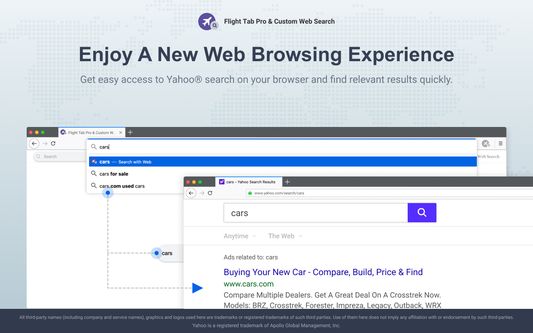 Install the Flight Tab Pro & Custom Web Search extension to track flight status & access flight info by clicking the favicon on the toolbar & enjoy Yahooยฎ search from your browser.
