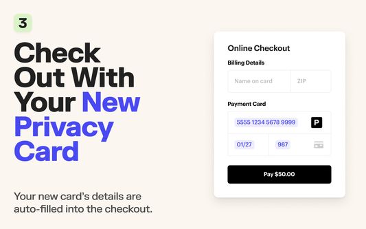 Download the Privacy add-on to quickly autofill unique, secure card numbers directly into checkout pages where traditional credit and debit cards are accepted. No more needing to get up and fish for your wallet at inconvenient times. No more memorizing a dozen card numbers. Simply use the browser extension and checkout in one click.