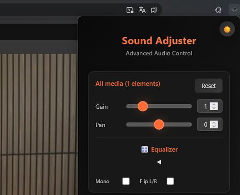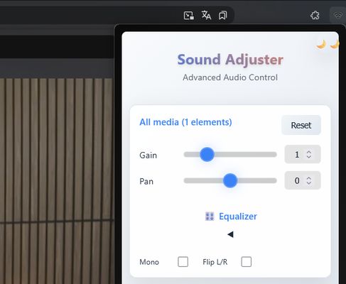 Sound Adjuster lets you control audio in your browser tabs. Adjust volume (gain) and stereo balance (pan) easily with a simple slider interface. Perfect for fine-tuning audio playback in real-time. Lightweight, fast, and easy to use!