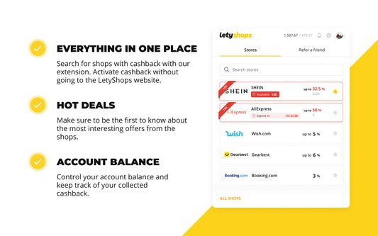 Wszystkie sklepy są na wyciągnięcie ręki. Nie musisz wchodzić na stronę internetową LetyShops. Aktywuj cashback za pomocą 1 kliknięcia bezpośrednio na stronie sklepu.