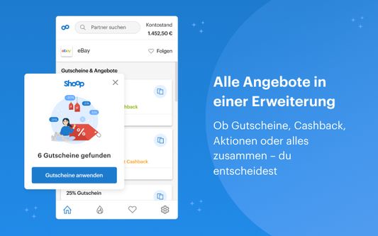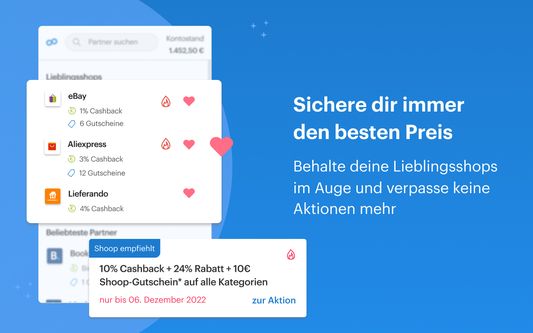 Hol’ dir jetzt den kostenlosen Cashback-Assistenten für deinen Browser und spare mit nur einem Klick bei all’ deinen Online-Bestellungen. Bei 2.000+ kooperierenden Online-Shops – darunter Top-Partner wie MediaMarkt, Lieferando, ebay, Groupon – sowie wöchentlichen Aktionen, exklusiven Gutscheinen und Rabatten ist für jeden etwas dabei. Die Zeitschrift Finanztest bestätigt Shoop: „Sehr hohe Rabatte und viele umsatzstarke Partnershops”.