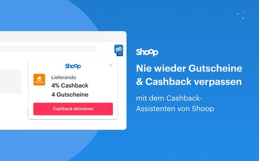 Die besten Gutscheine + Cashback – mit dem Cashback-Assistenten von Shoop shoppst du dich ganz nebenbei reich! Mit uns sammeln inzwischen über 1,7 Millionen Nutzer durchschnittlich 260 € Cashback im Jahr.