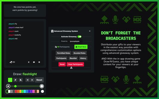 — Participation with customizable chat commands (“!mokick,” “gimme giveaway,” etc.)