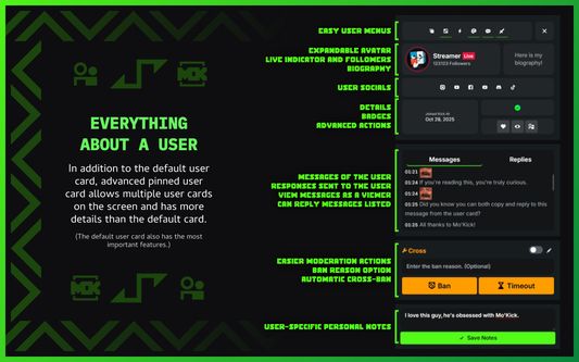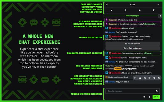 Mo'Kick is your supporter that builds your Kick experience from top to bottom. For chat, video, streamer/moderator panel, and more.