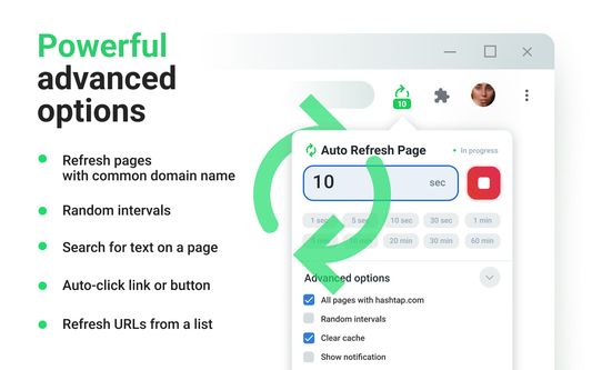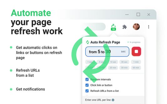 Auto Refresh Page - это расширение для браузера, которое автоматически обновляет страницы через указанные интервалы времени. Просто введите количество секунд между обновлениями и нажмите кнопку «Старт».