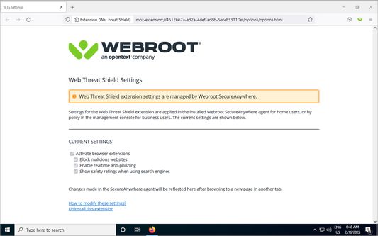 Webroot Web Threat Shield также предоставляет самые свежие данные о репутации веб-сайтов и в режиме реального времени обеспечивает защиту от фишинговых сайтов.