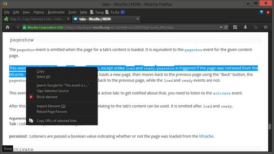 - selecting links, then right-clicking another link and clicking the context menu item will copy the URLs of the links you selected and of the link you right-clicked