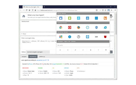 User-Agent Switcher can quickly and easily changes your browser's user-agent. There are 26 popular user-agent strings to choose from!